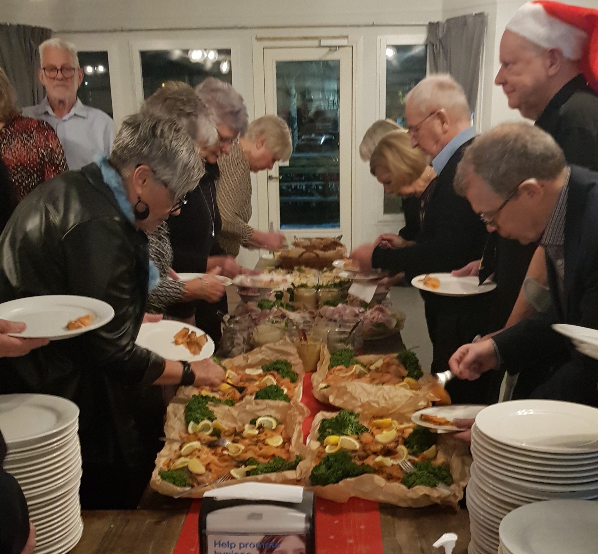 Grill & Mingel-kommittén bjuder in till julbord tillsammans med restaurang Stora Parken. Vi sitter inomhus i den mysigt juldekorerade restaurangen och njuter av det härliga julbordet. Lekledaren kommer med kluriga julklappsrim. Gunnar Morén spelar julmusik som vi känner igen.