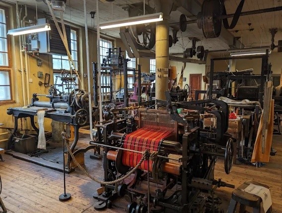 ut då, ser den ut idag. Här finns vävstolar i långa rader, bandvävstolar,flätmaskiner, spetsmaskiner, tvinnmaskiner,varpor och bomställningar.