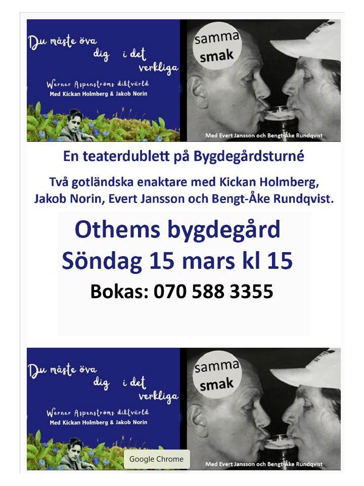 Det blir gotländsk teater på 6 bygdegårdar i februari. Två dråpliga enaktare av helt olika karaktär där du får möta fyra välmeriterade gotländska aktörer.