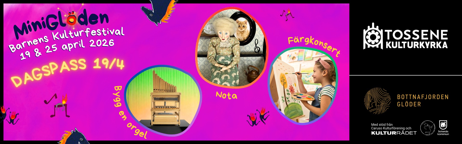 MiniGlöden arrangeras av Tossene Kulturkyrka med stöd av Kulturrådet och Caruso Kulturförening som en del av Bottnafjorden Glöder.