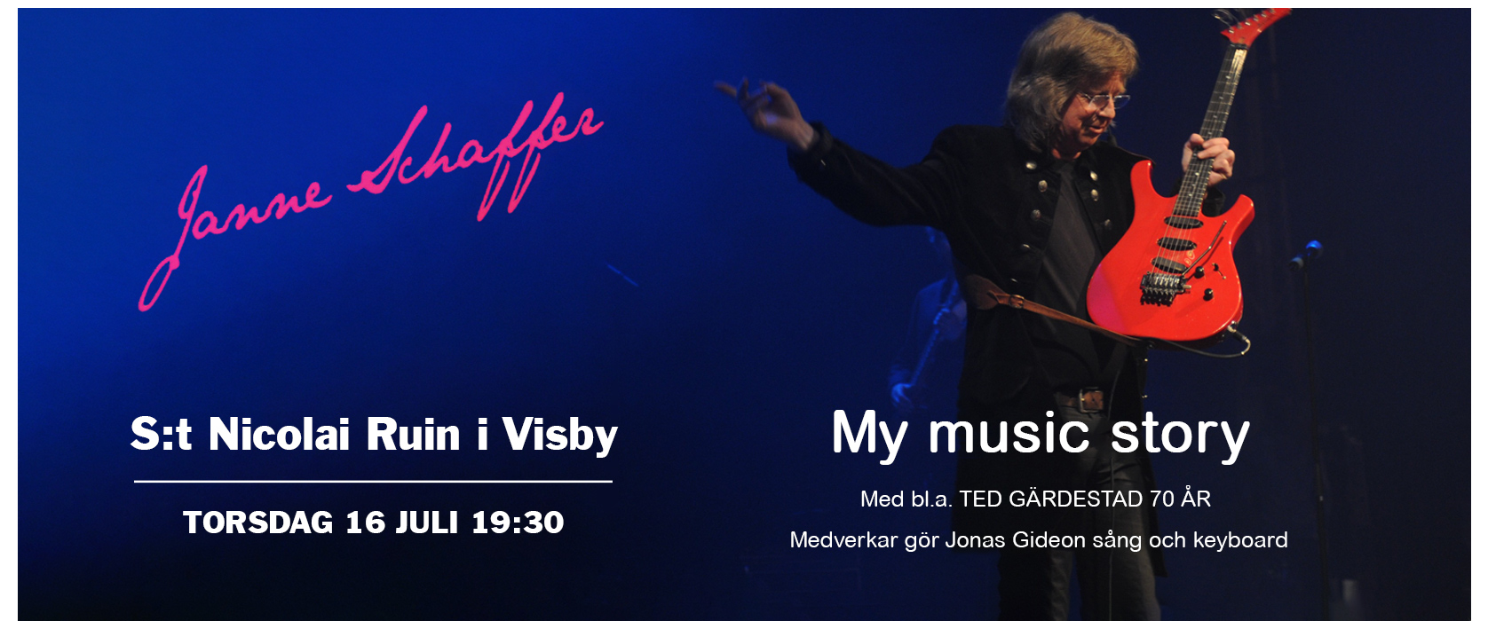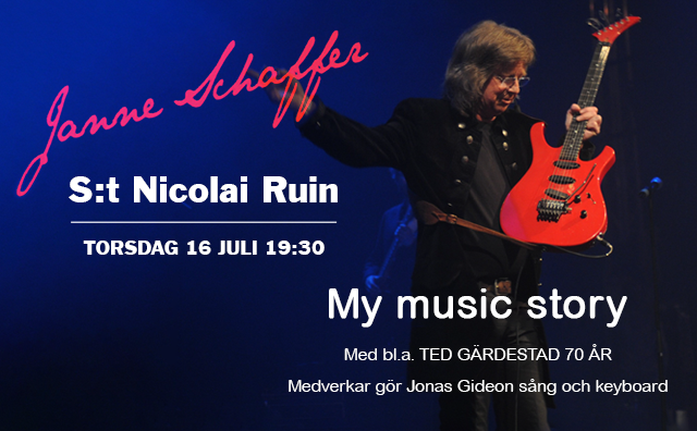 Janne Schaffer kommer till Gotland med en skattkista av historier från sitt långa musikerliv samt mängder av musik. Med sig har han pianisten och sångaren Jonas Gideon.