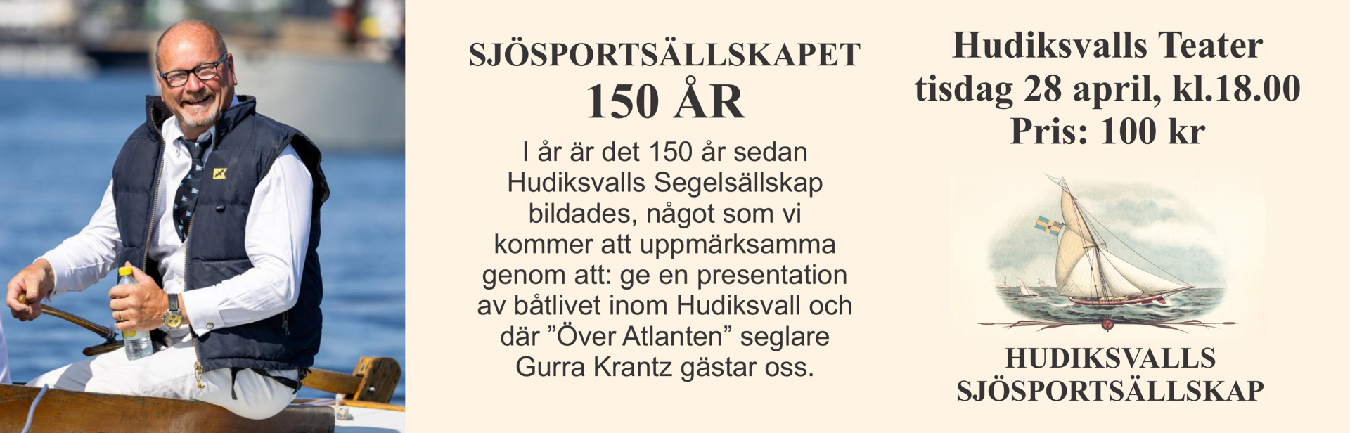 I år är det 150 år sedan Hudiksvalls Segelsällskap bildades, något som vi kommer att uppmärksamma genom att ge en presentation av båtlivet inom Hudiksvall och där "Över Atlanten" seglare Gurra Krantz gästar oss.